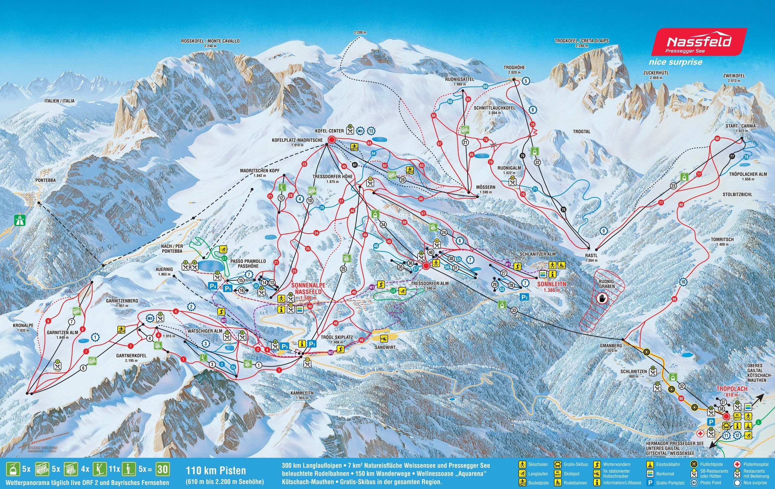 U zoekt informatie over de actuele sneeuwcondities? Hier vindt u de actuele weersvoorspelling van de komende dagen in Nassfeld-Hermagor. Normaal gesproken kunt u ook een nog betere indruk krijgen via de webcam. Daarnaast kunt u de geopende skiliften in Nassfeld-Hermagor zien en de actuele sneeuwhoogtes op de berg en in het dal. Het diagram vergelijkt de sneeuwverhoudingen met die van vorig jaar en ook met die van het gehele seizoen in Nassfeld-Hermagor.